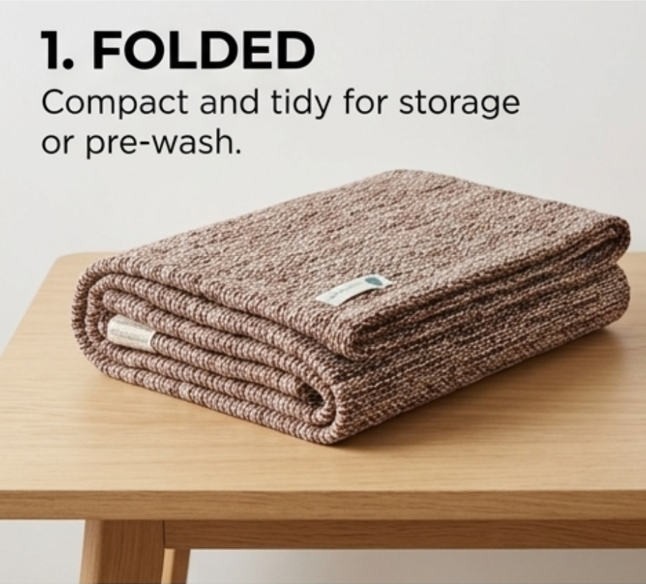 100% organic cotton on both sides. No rubber, no coatings. Machine washable — cold, gentle cycle, air dry. Fully reversible. Fully compostable at end of life. Will move on smooth studio floors without a grip layer beneath. Best on carpet, grass, rough surfaces, and layered over an existing mat.